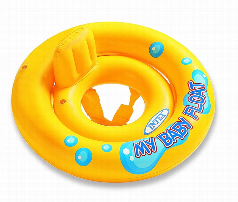 Intex: My Baby Float with Pillow Backrest. This floating baby seat is 26.5 diameter and has a large ring with smaller inner ring for stability. Smooth seat straps and a pillow backrest. 2 air chambers 33lbs maximum weight limit. Yellow with blue print. For ages 1-2 years